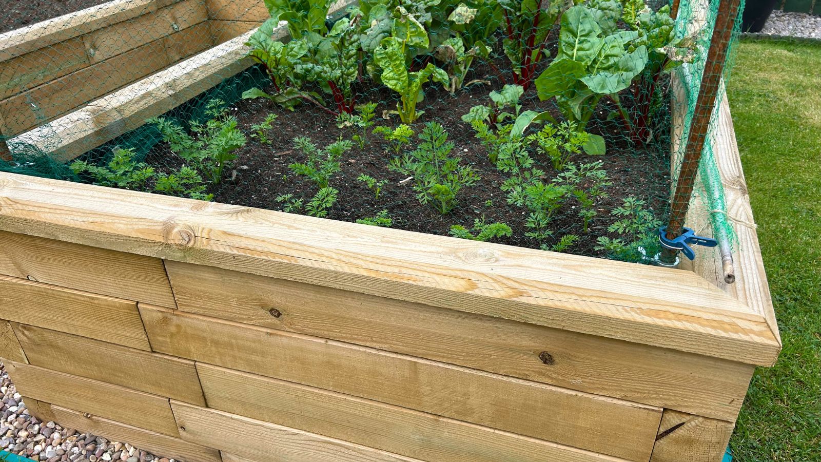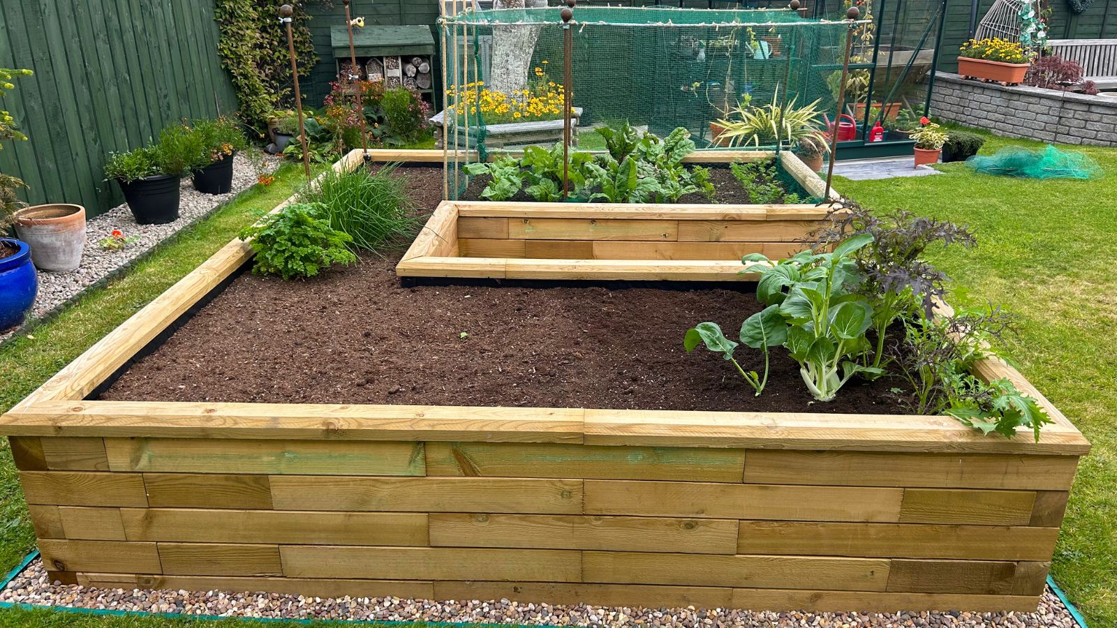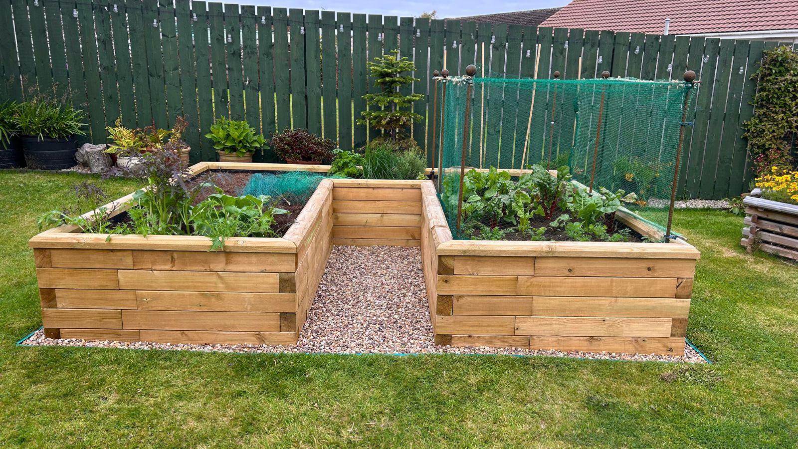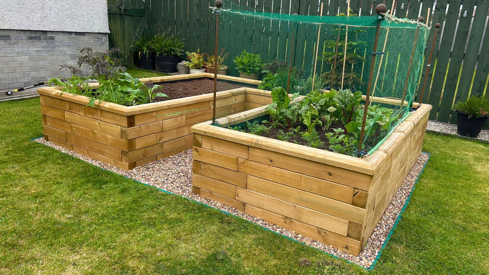 Colin and Alison now have a large and ample space to begin their vegetable growing journey. Adding the finishing touches, the kitchen garden has been expertly finished with a border of pebbles and stones to complete the area. Depending on what vegetables are being grown, Colin and Alison opted for the option to include crop protector poles which will come in handy should they need to use them.