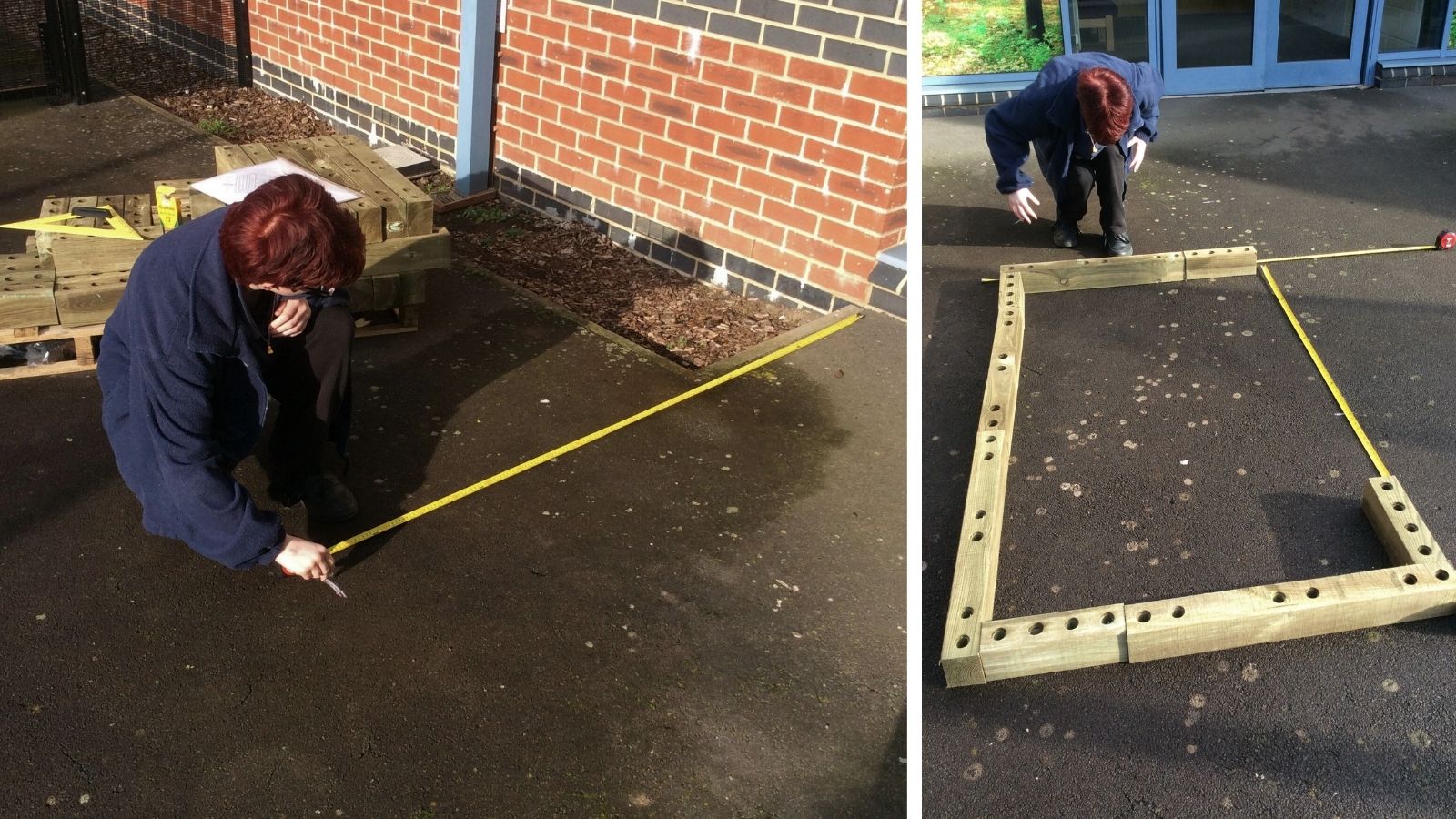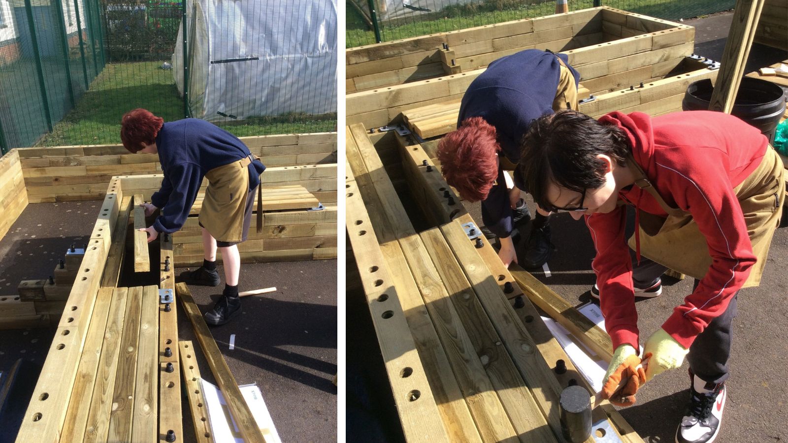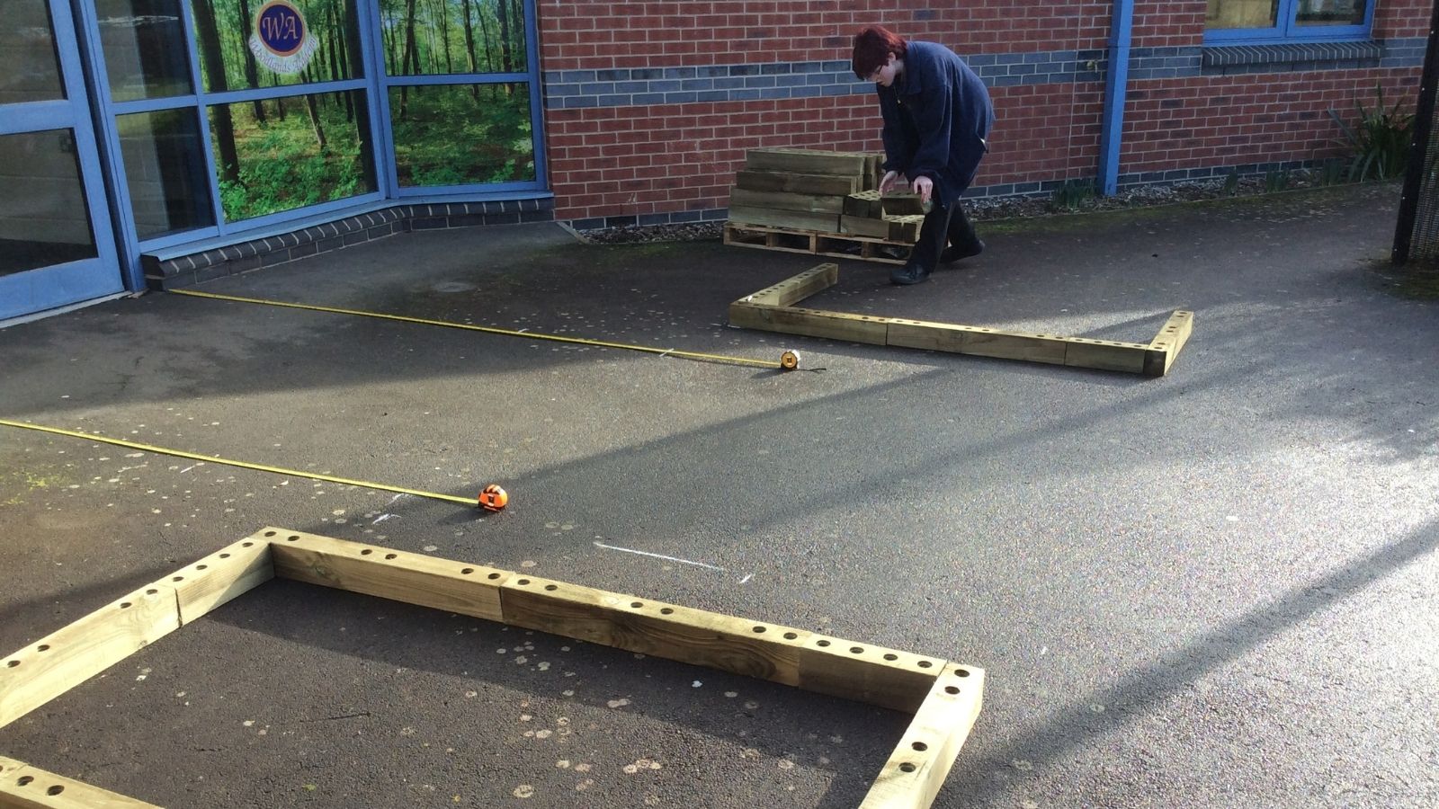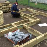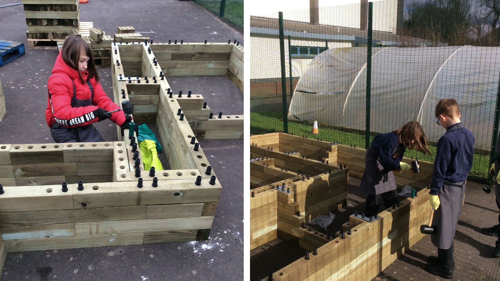 As the planters were being built on a tarmac playground, there was minimal preparation work required. Careful consideration was used to choose the areas of the playground that were most level to begin the WoodBlocX build. The children were involved in all aspects of the project, they began by measuring out the spaces to ensure the raised beds were built in the right place. When building on hard ground types, you can choose to include angle floor brackets to secure your WoodBlocX structure to the ground. Learn more about the different ground type fixings.