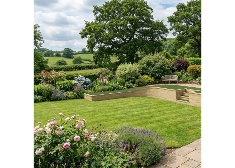 This design was provided to replace a curved log roll retaining wall and create an additional border for an outdoor decking area. Stepping the wall up and back down suited the sloping nature of the upper garden perfectly.