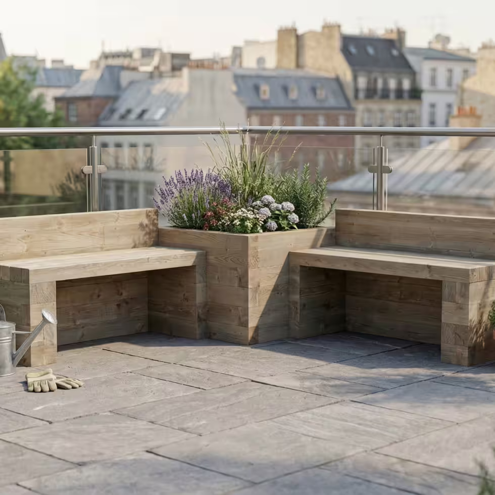 Double Garden Bench with Corner Planter / 1.875 x 1.875 x 0.65m