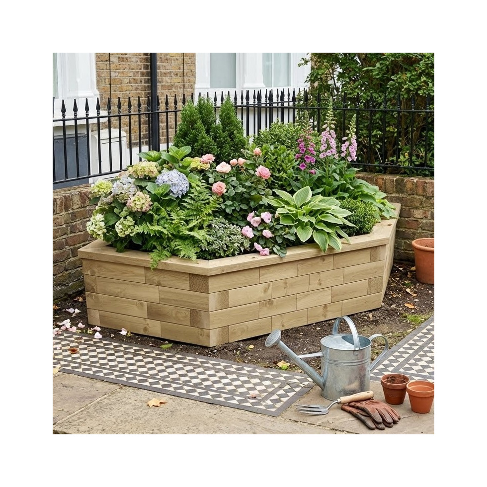 Bring some bling to your garden with this diamond shaped wooden planter. The sides along the straight sides are 1.5m each and the visible side has three faces. Perfect for bringing greenery to an unloved corner of the garden or patio.
