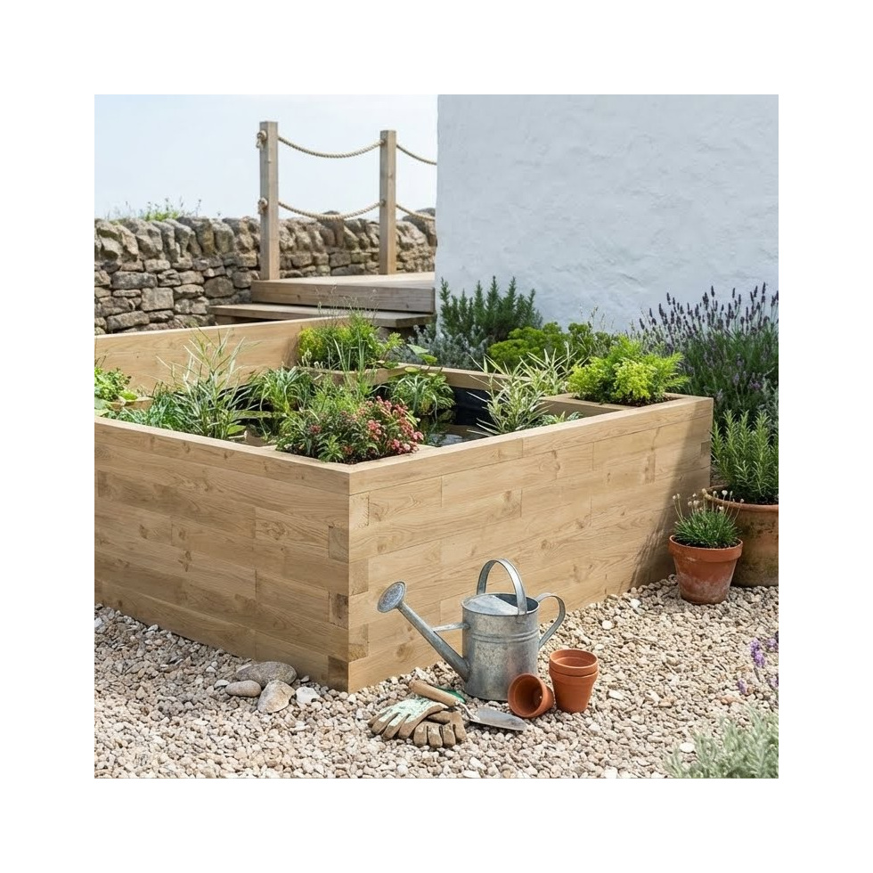 Add this large raised pond kit to your garden to make an impressive centrepiece. Designed with a low back wall and 4 corner planters, it's the perfect size for building on a decking area or a patio.
