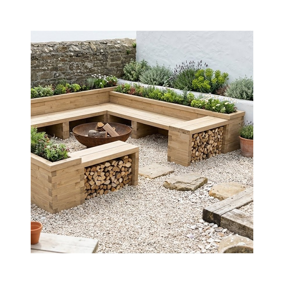 Our square fire pit bench planter makes for a remarkable garden centrepiece for any home. Uniform rectilinear shapes makes for a modern look and sports sheltered storage for logs whilst acting as tables for drinks and food. Why not even use the planting space for spices and herbs for barbecuing?